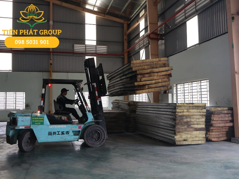 Tiến Phát Group cho thuê xe nâng dầu Mitsubishi 3 tấn chuyên dụng thực hiện công tác luân chuyển và sắp xếp các kiện tấm panel cách nhiệt và vật tư xây dựng, hỗ trợ thi công và hoàn thiện nhà xưởng tại KCN Đại Đăng.