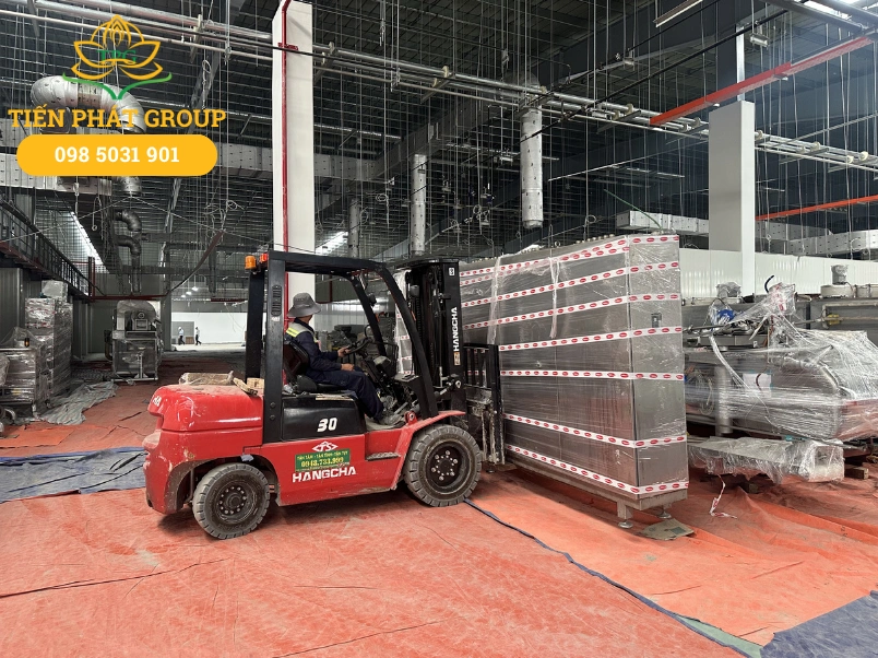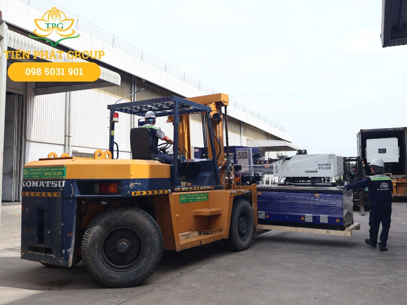 Tiến Phát Group cho thuê xe nâng dầu Komatsu 10 tấn thực hiện rút máy từ thùng container và di dời hệ thống máy móc công nghiệp nặng cho nhà máy sản xuất linh kiện phụ trợ tại KCN Đại Đăng, Thủ Dầu Một.