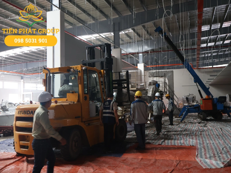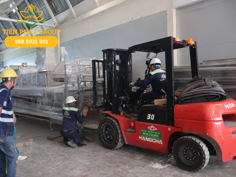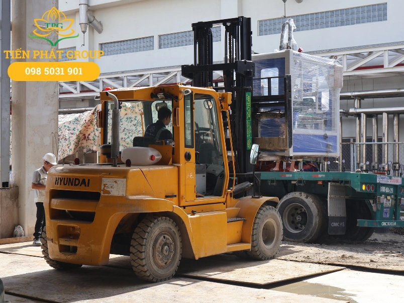 Tiến Phát Group đã huy động xe nâng dầu Hyundai 10 – 16 tấn, kết hợp với đội ngũ tài xế kỹ thuật và hệ thống tấm lót sàn thép chuyên dụng để thực hiện tháo dỡ và di dời tổ hợp máy móc cơ khí từ xe container sơ-mi rơ-moóc vào vị trí lắp đặt chân đế định sẵn bên trong nhà xưởng mới đang thi công.