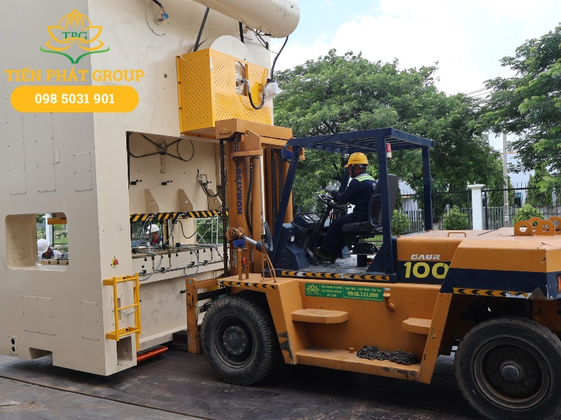 Điều động 2 xe nâng dầu hạng nặng 7 tấn và 10 tấn, kèm đội ngũ tài xế tiến hành cẩu kéo hệ thống máy dập kim loại từ xe fooc xuống nền xưởng an toàn tuyệt đối.